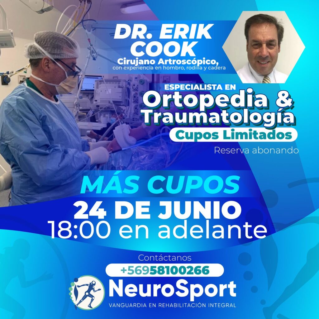 El próximo viernes 24 de junio estará en Neurosport el médico cirujano de la Universidad de Chile, traumatólogo de larga trayectoria, con beca de ortopedia y traumatología en Universidad Católica de Chile, Doctor Erik Cook.